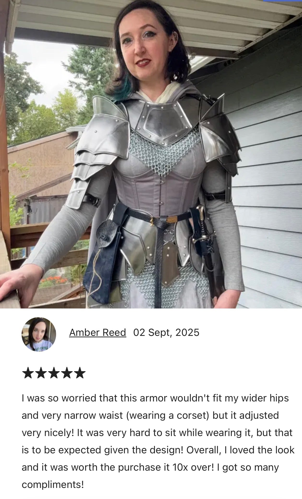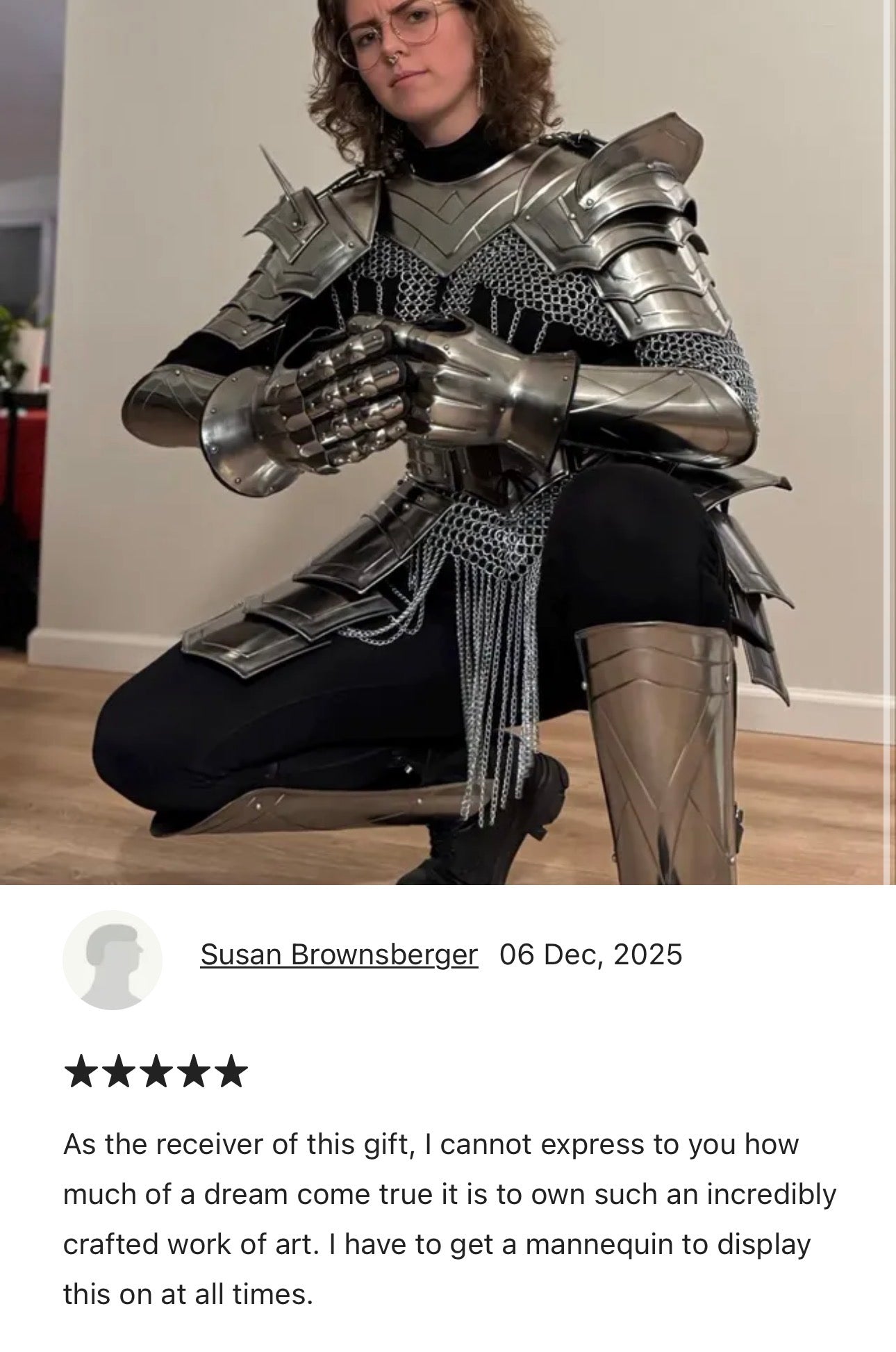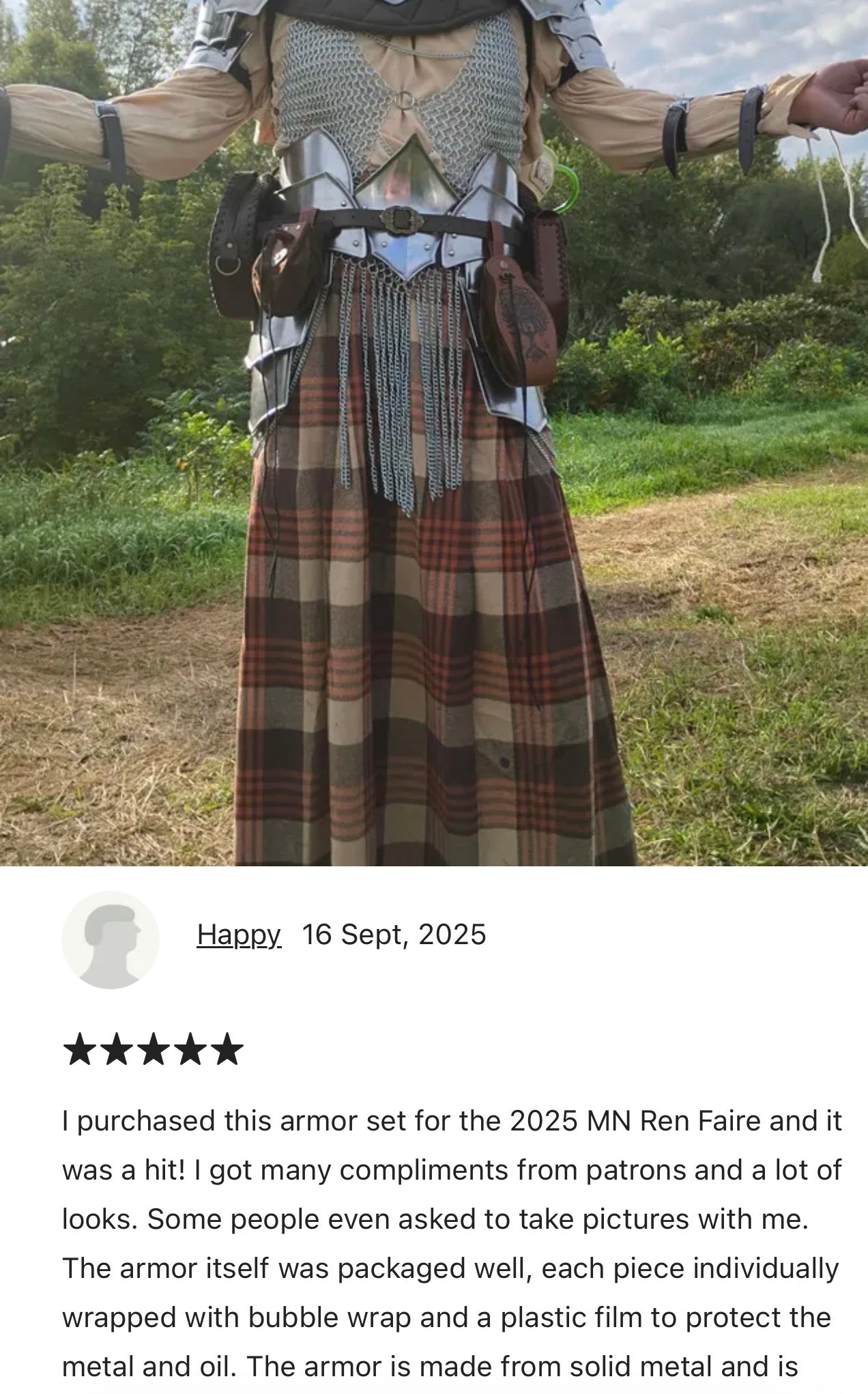 Your armor is individually handcrafted using traditional methods and quality steel.