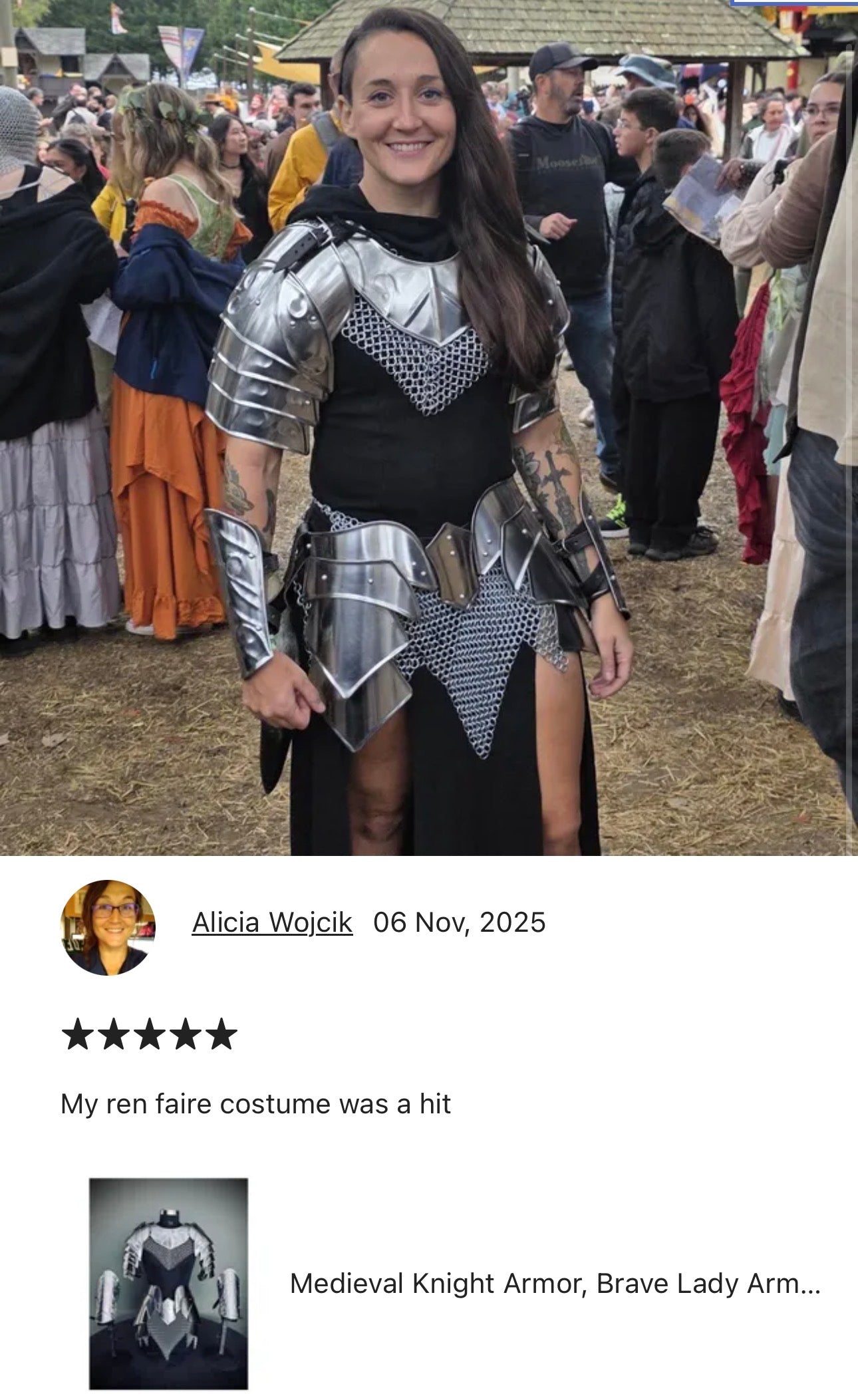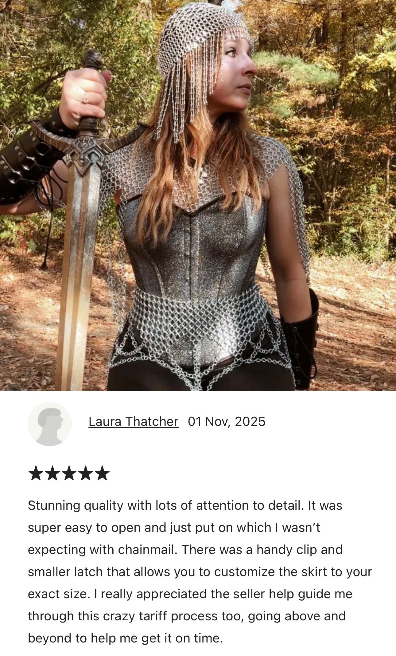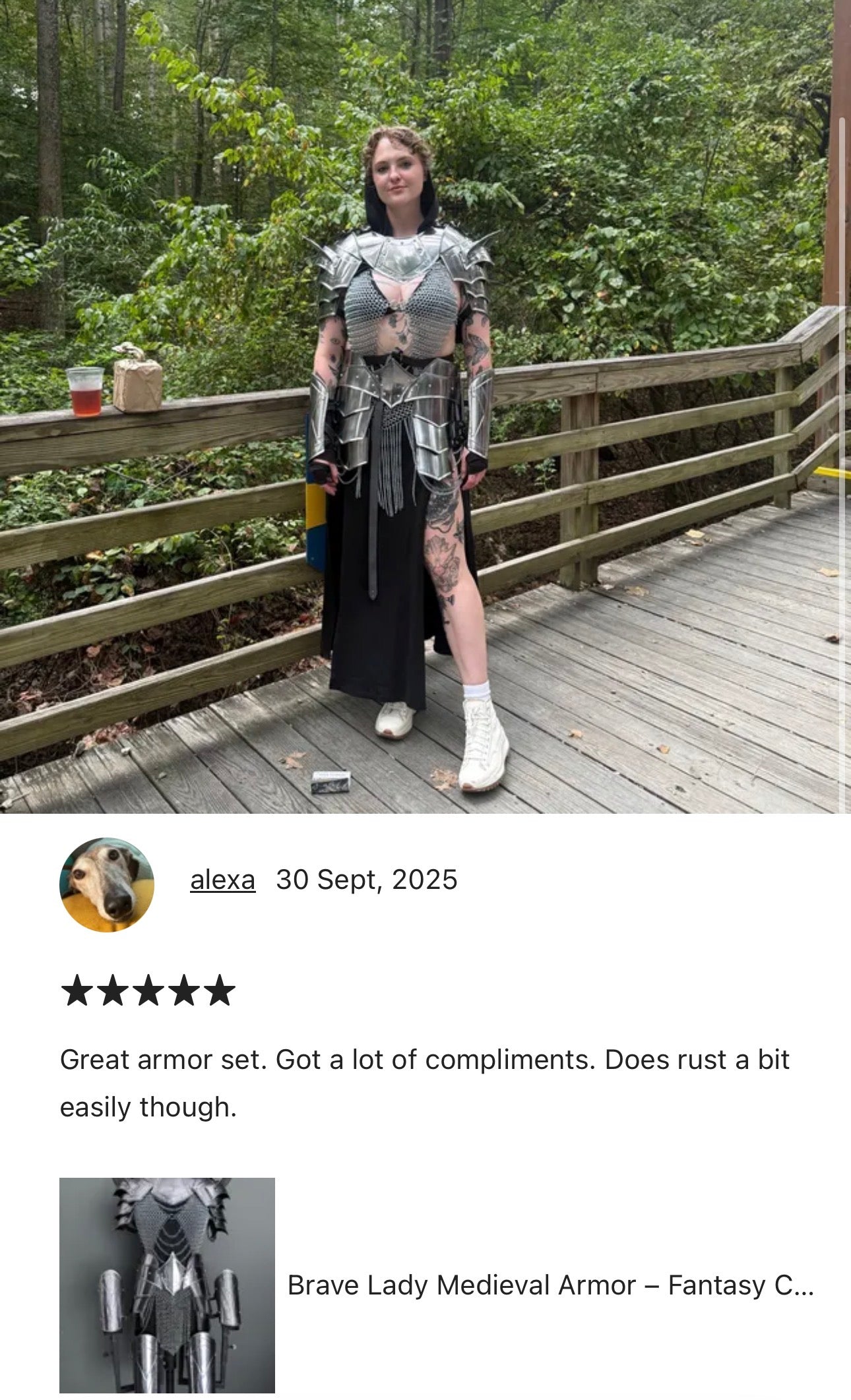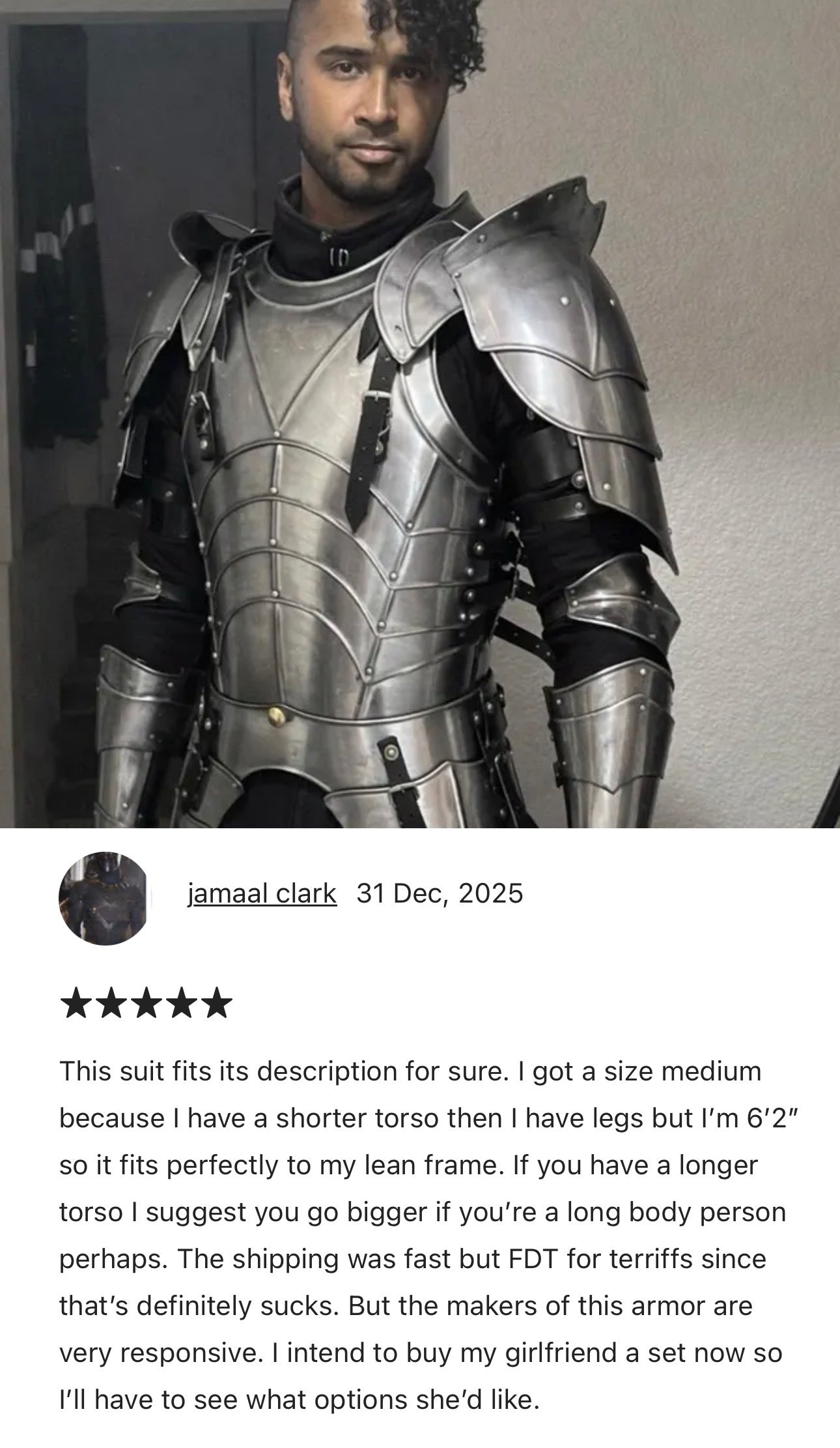Your armor is individually handcrafted using traditional methods and quality steel.